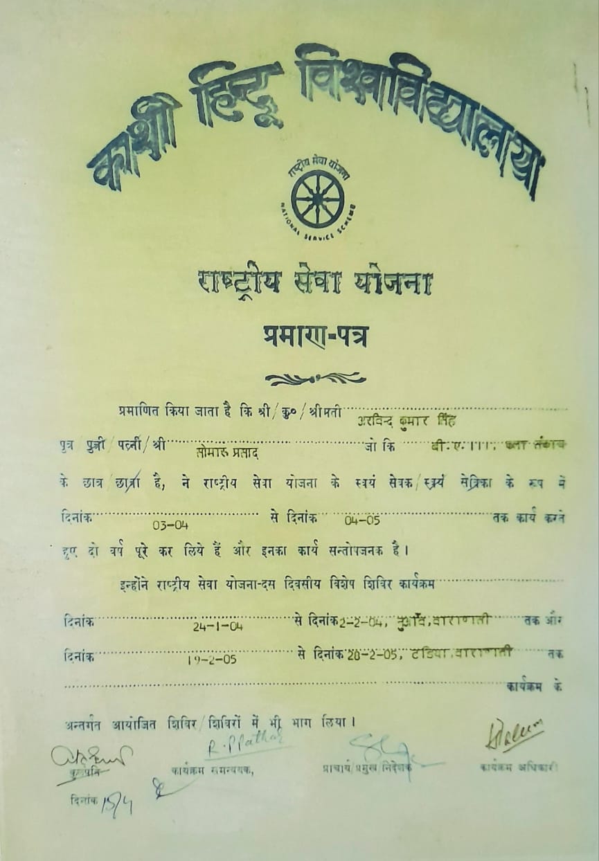 | 1. | NATIONAL SERVICE SCHEME | Participated | BANARAS HINDU UNIVERSITY, VARANASI | 19 Feb 2005 | 01 Jan 1970 | document | |||||